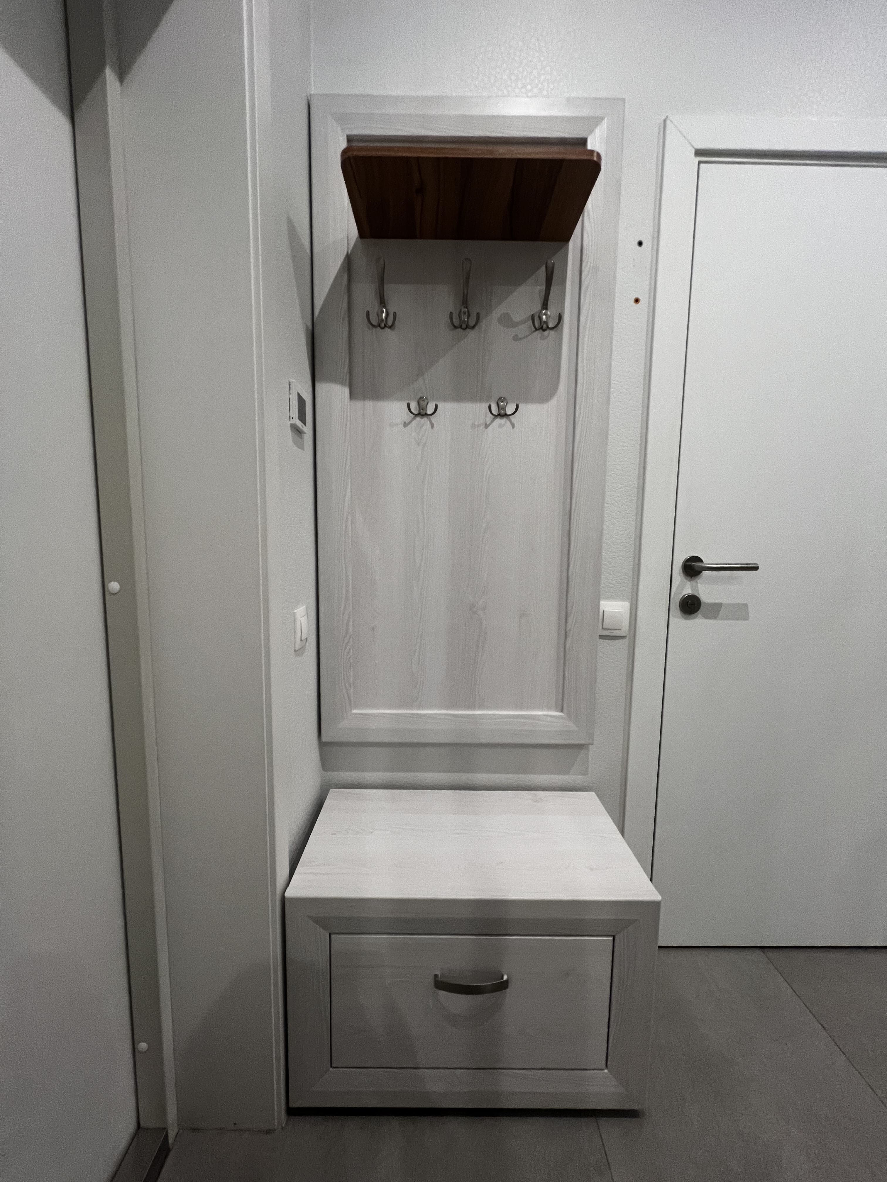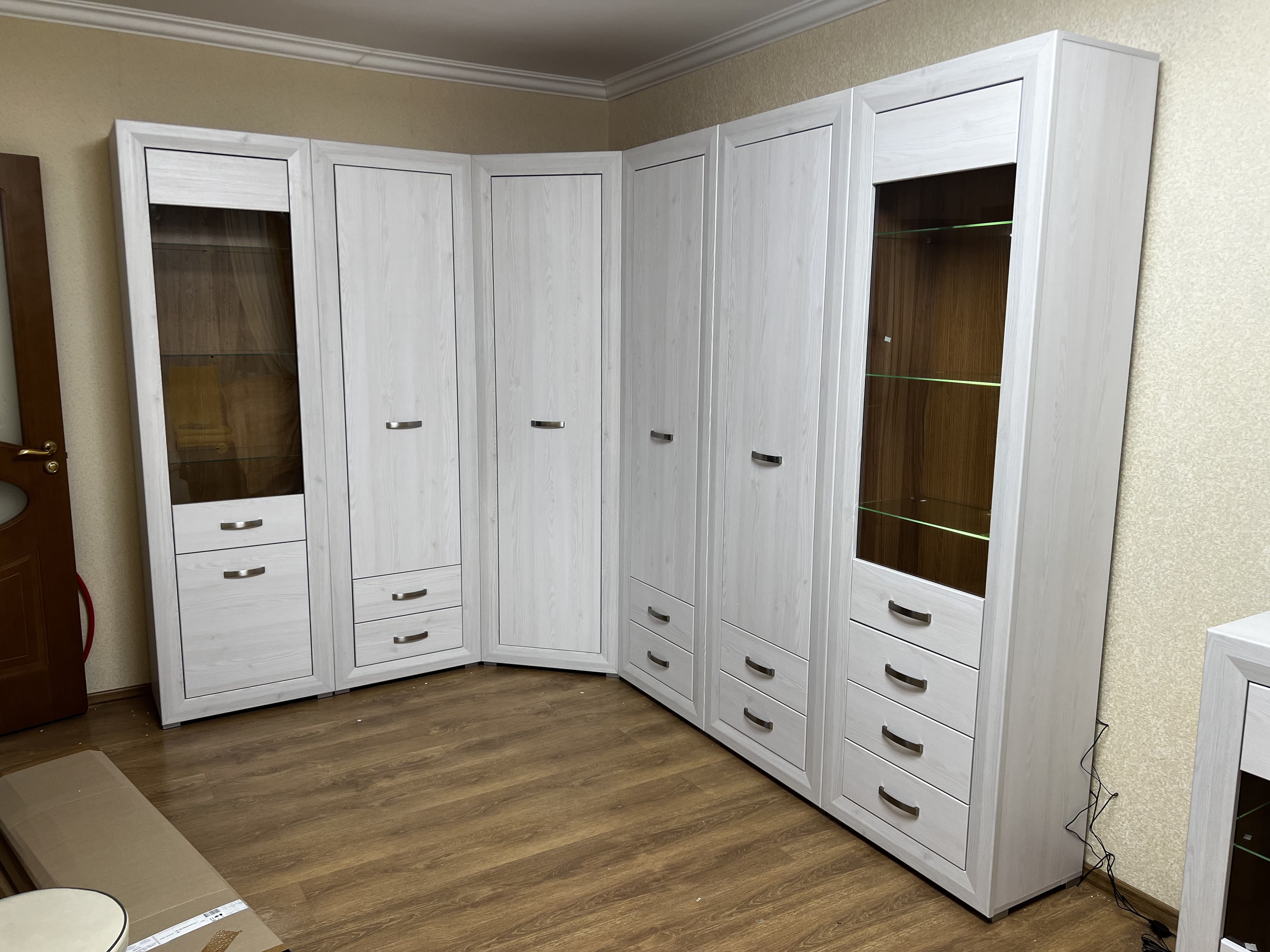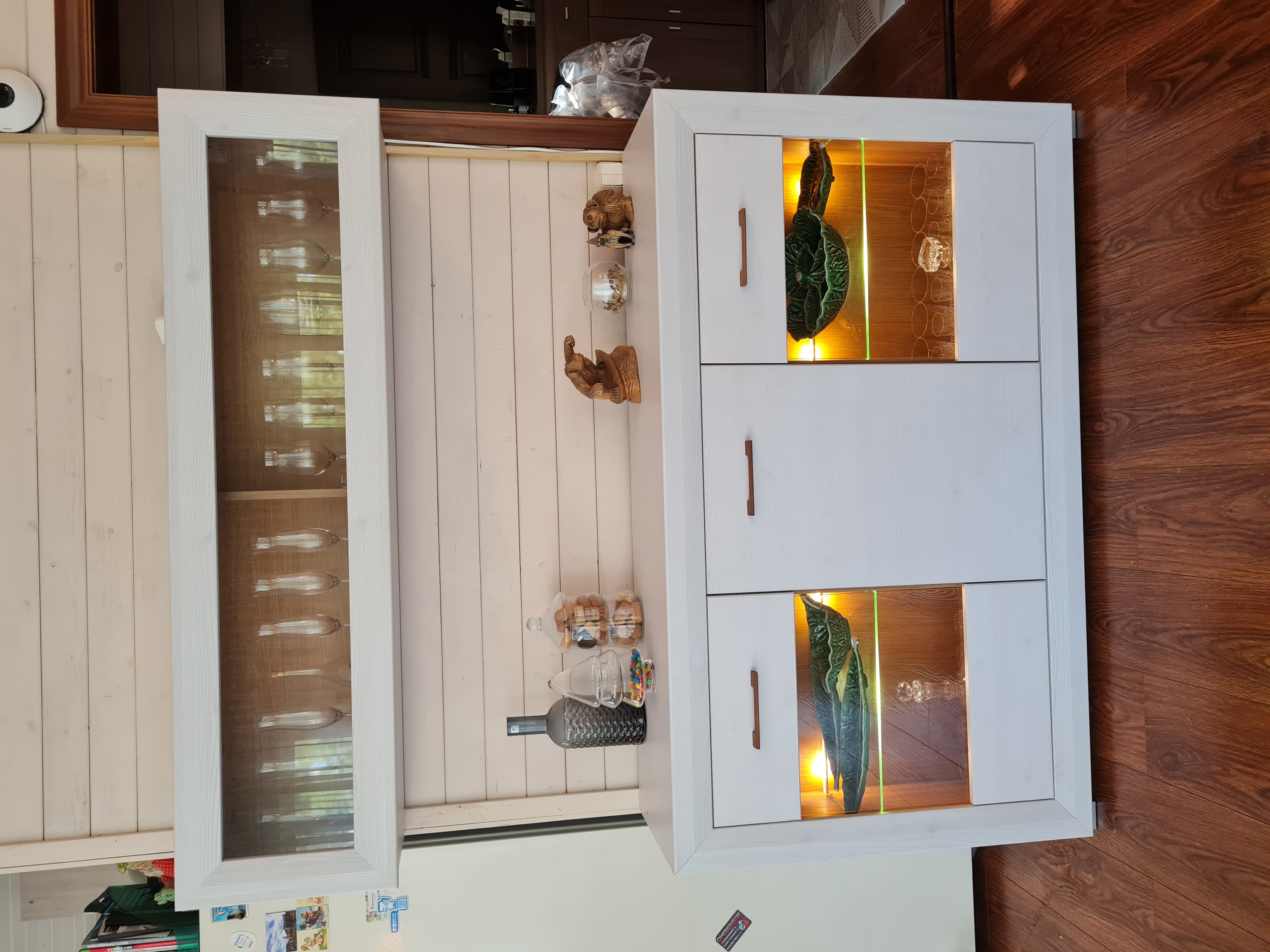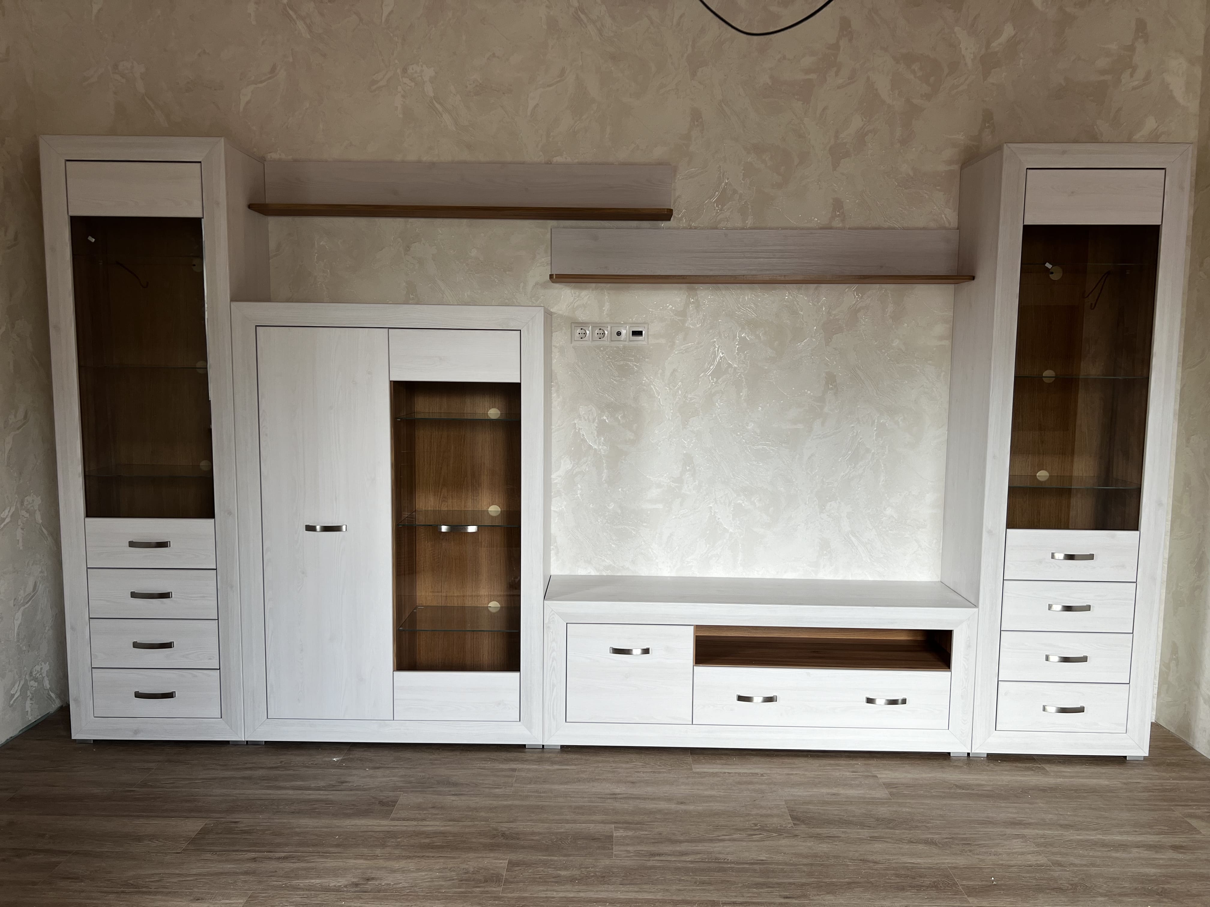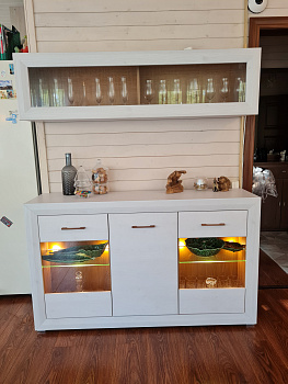Великолепные фасады изделий Мальта удачно контрастируют со вставками цвета Орех лион, металлические ручки добавляют изящества, а подсветка стеклянных полок выгодно подчеркивает древесную текстуру.