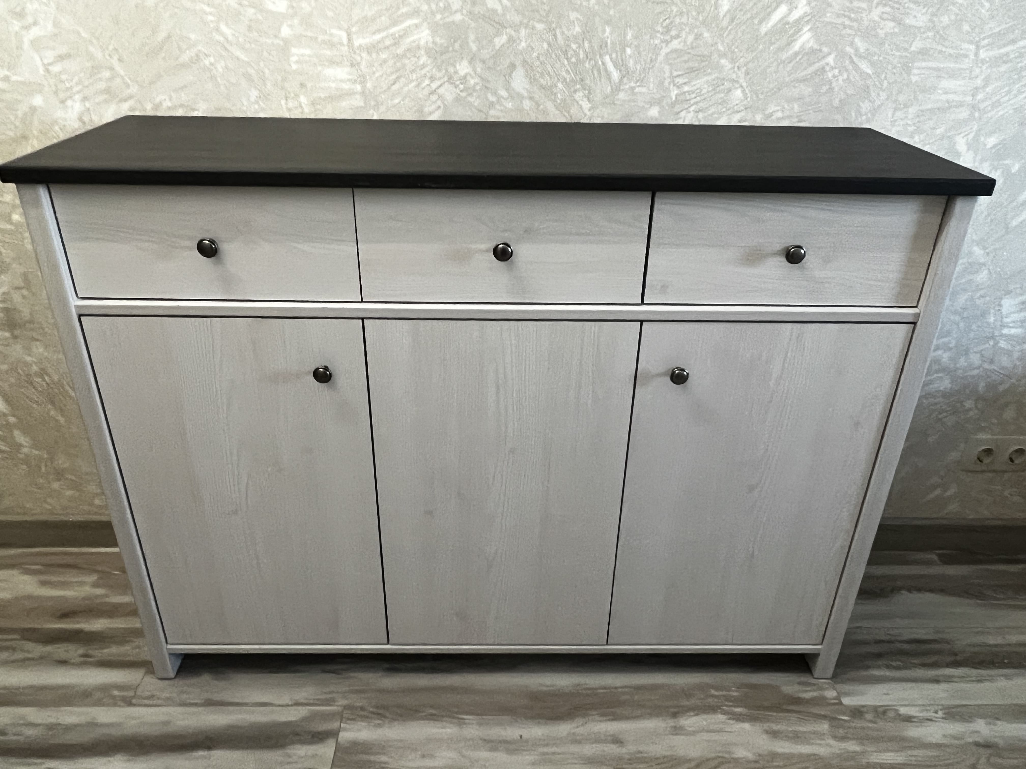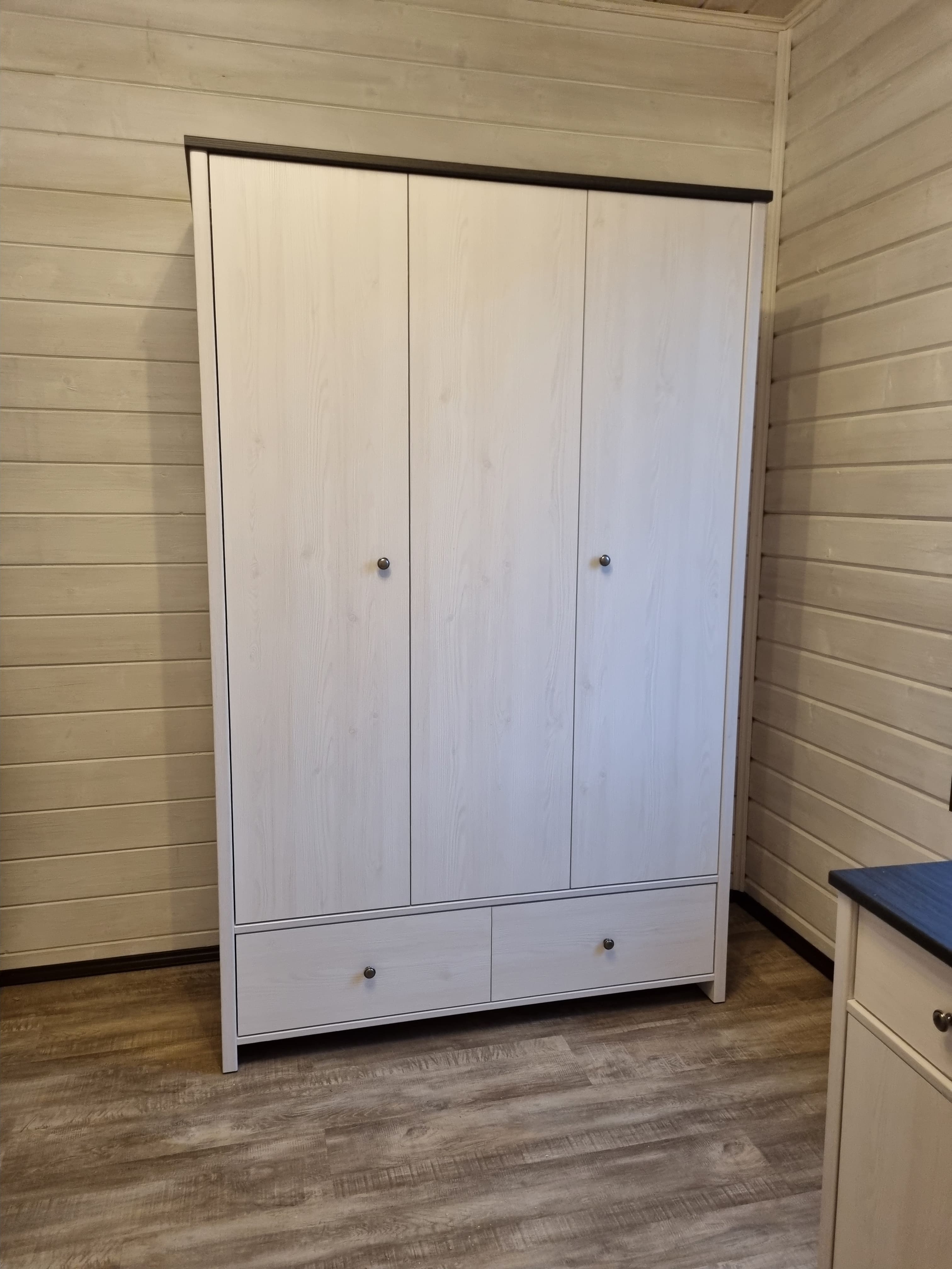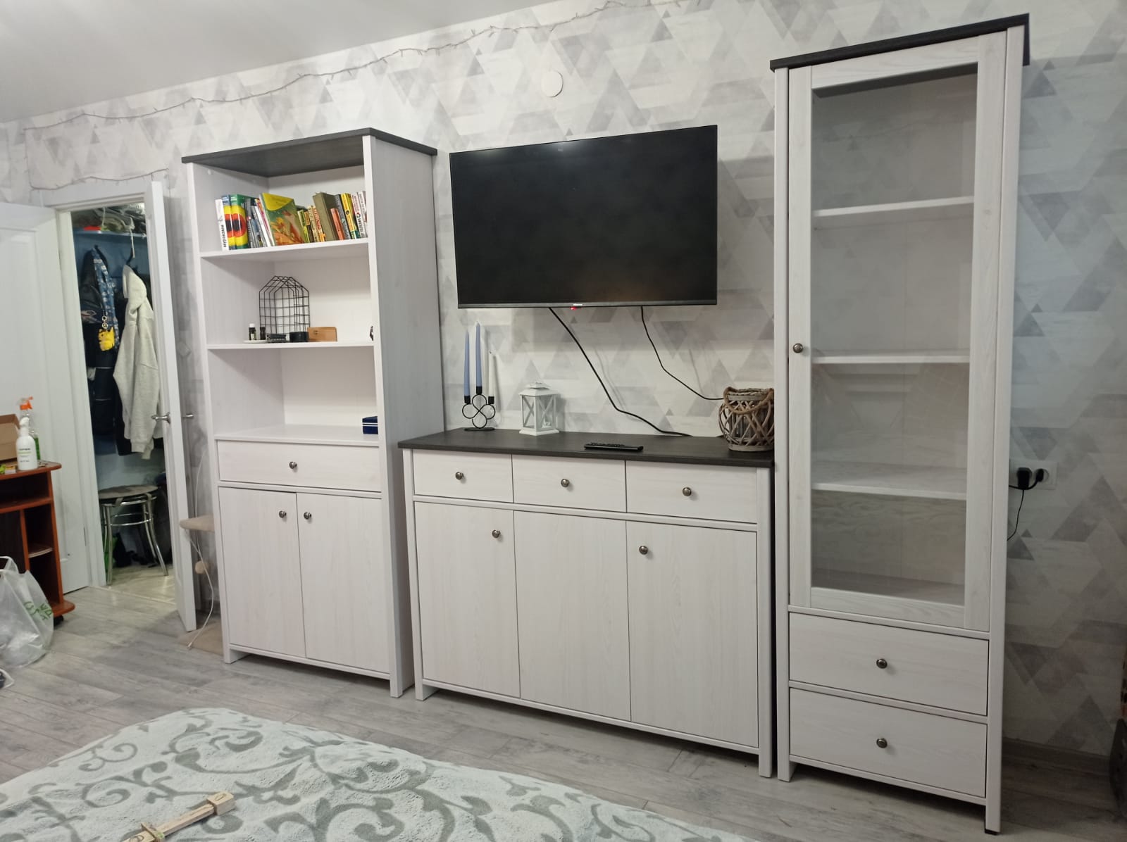 Светлые цвета корпуса и фасада в сочетании с тёмным цветом верхних щитов в цвете Сосна ларико создадут уютный интерьер в скандинавском стиле. Разнообразие элементов мебели по размерам и функциональности позволит Вам оформить стильную гостиную.